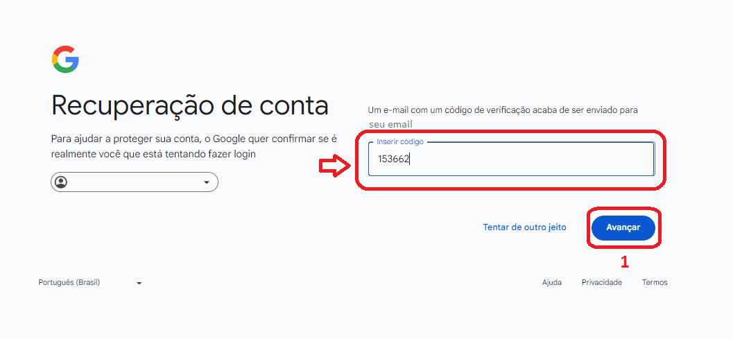 e) Insira o código que chegou no seu outro email que está vinculado ao institucional e clique em (1) Avançar;
