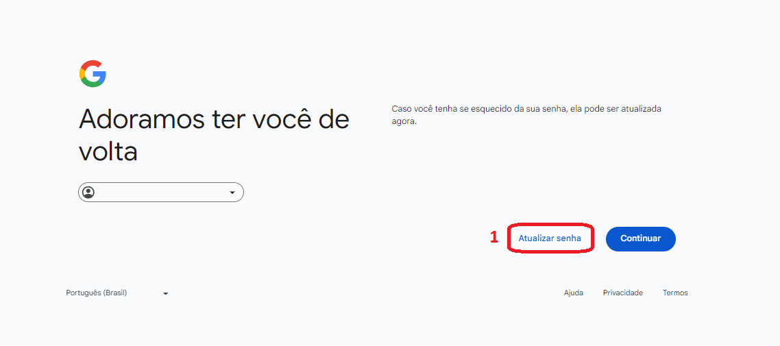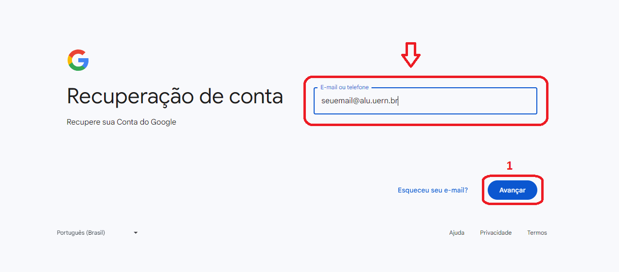 a) Para recuperar a senha, acesse o link: https://accounts.google.com/v3/signin/recoveryidentifier?flowName=GlifWebSignIn&dsh=S-116924630%3A1714137601050016&ddm=0 ,  preencha o campo com seu email e clique em (1) Avançar;