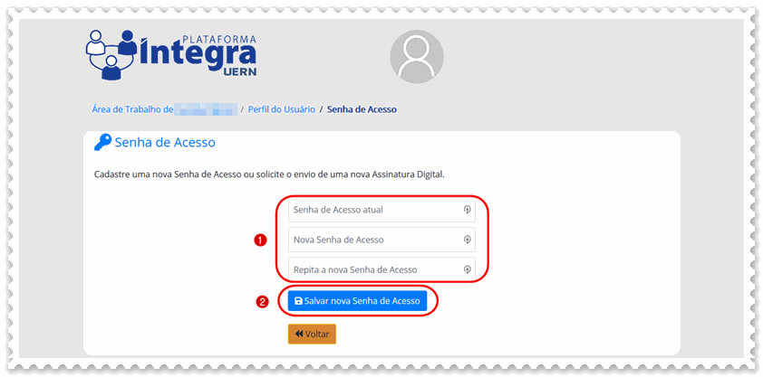 d) Informe a (1) senha atual, a nova senha, repita a nova senha e clique em (2) salvar nova senha de acesso.