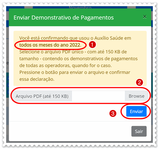 h) Confira novamente se os (1) meses estão corretos, anexe o (2) comprovante de utilização e clique em (3) enviar.