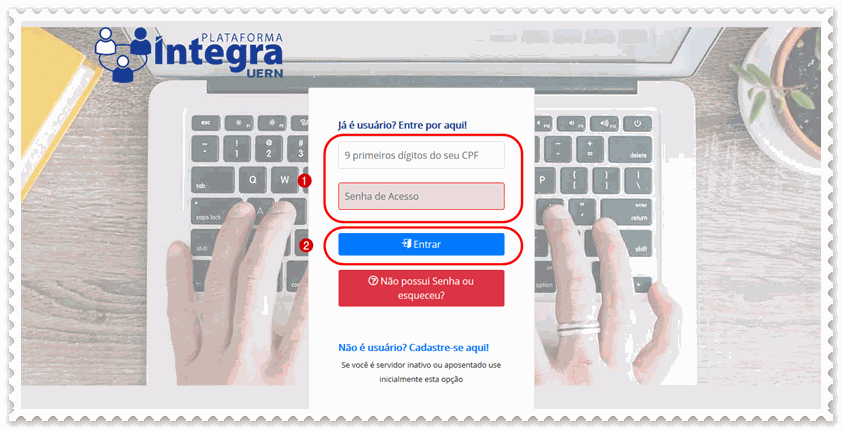 a) Acesse a plataforma Íntegra https://seguro.uern.br/integra, preencha (1) login e senha e clique em (2) entrar;