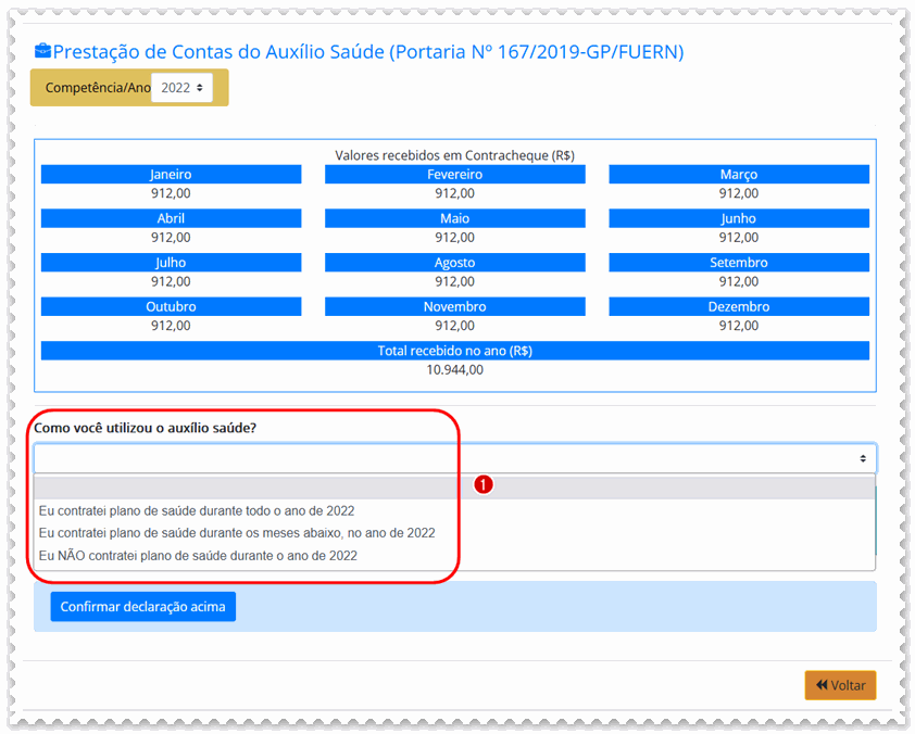 g) Confira se os (1) meses selecionados estão de acordo com a sua utilização e clique em (2) confirmar declaração acima;