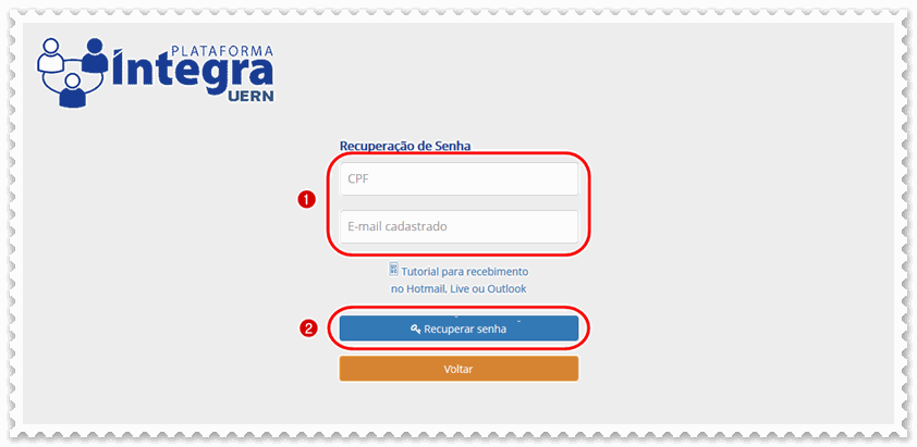 b) Preencha o (1) CPF, e-mail cadastrado e clique em (2) recuperar senha.