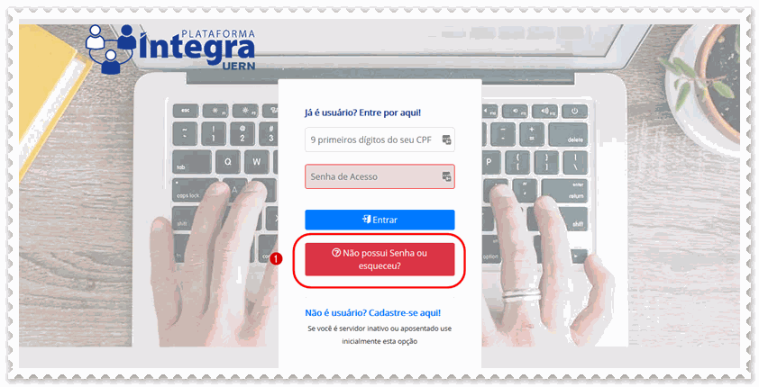 a) Acesse a plataforma Íntegra https://seguro.uern.br/integra e clique em (1) não possui senha ou esqueceu.