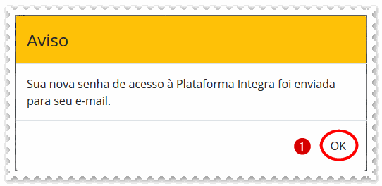c) Observe a mensagem de confirmação do envio da nova senha para o e-mail cadastrado e clique em (1) ok.