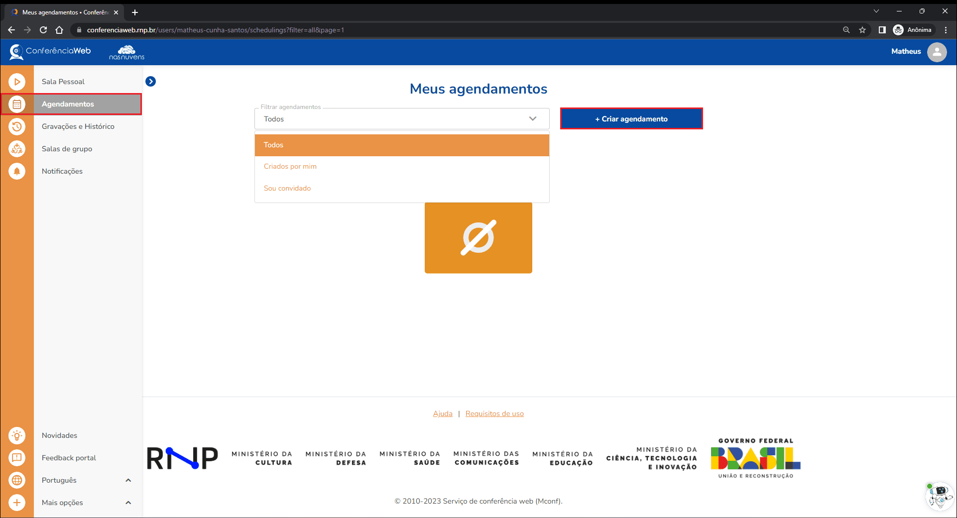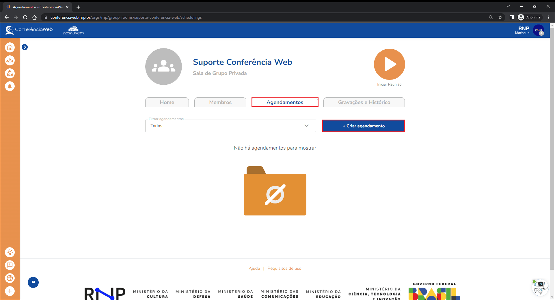 Nesta seção você poderá realizar o agendamento desta sala de grupo, para agendar basta acessar o menu “Agendamento” e em seguida, clicar na opção “+ Criar agendamento”.