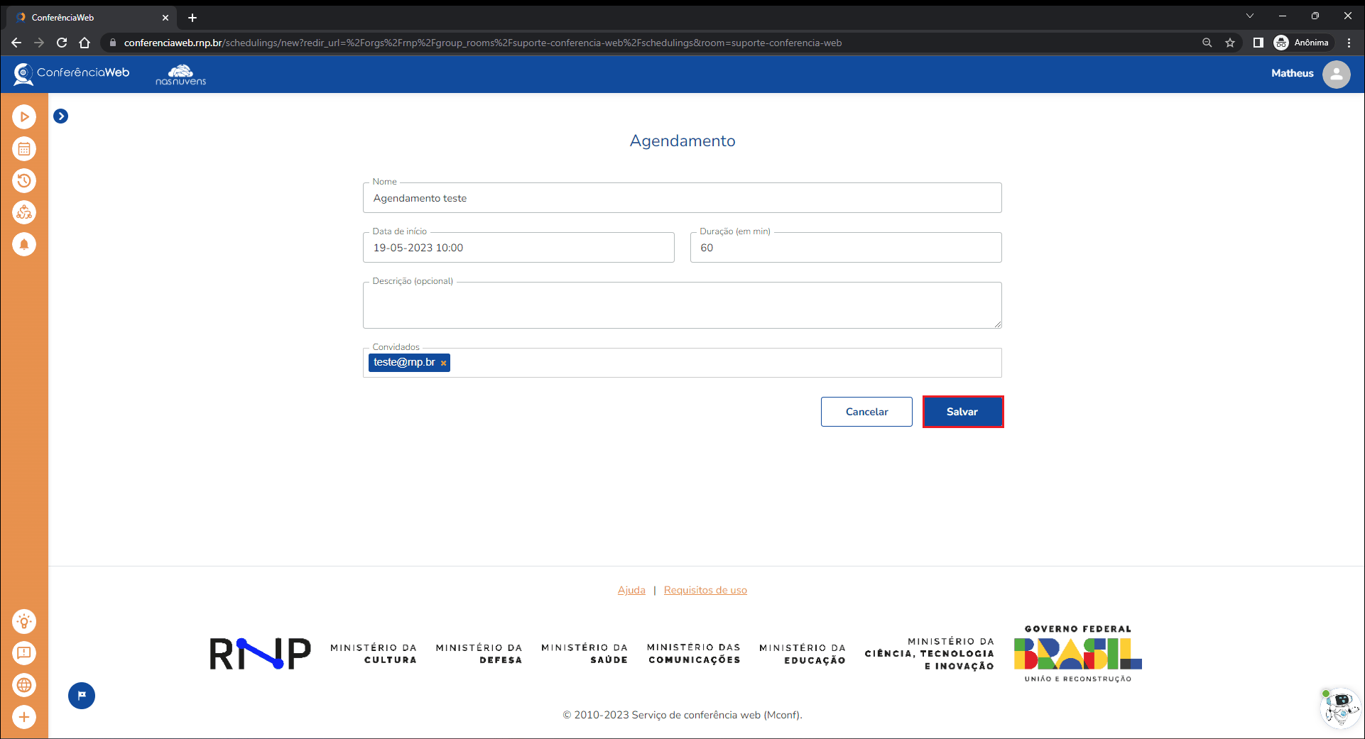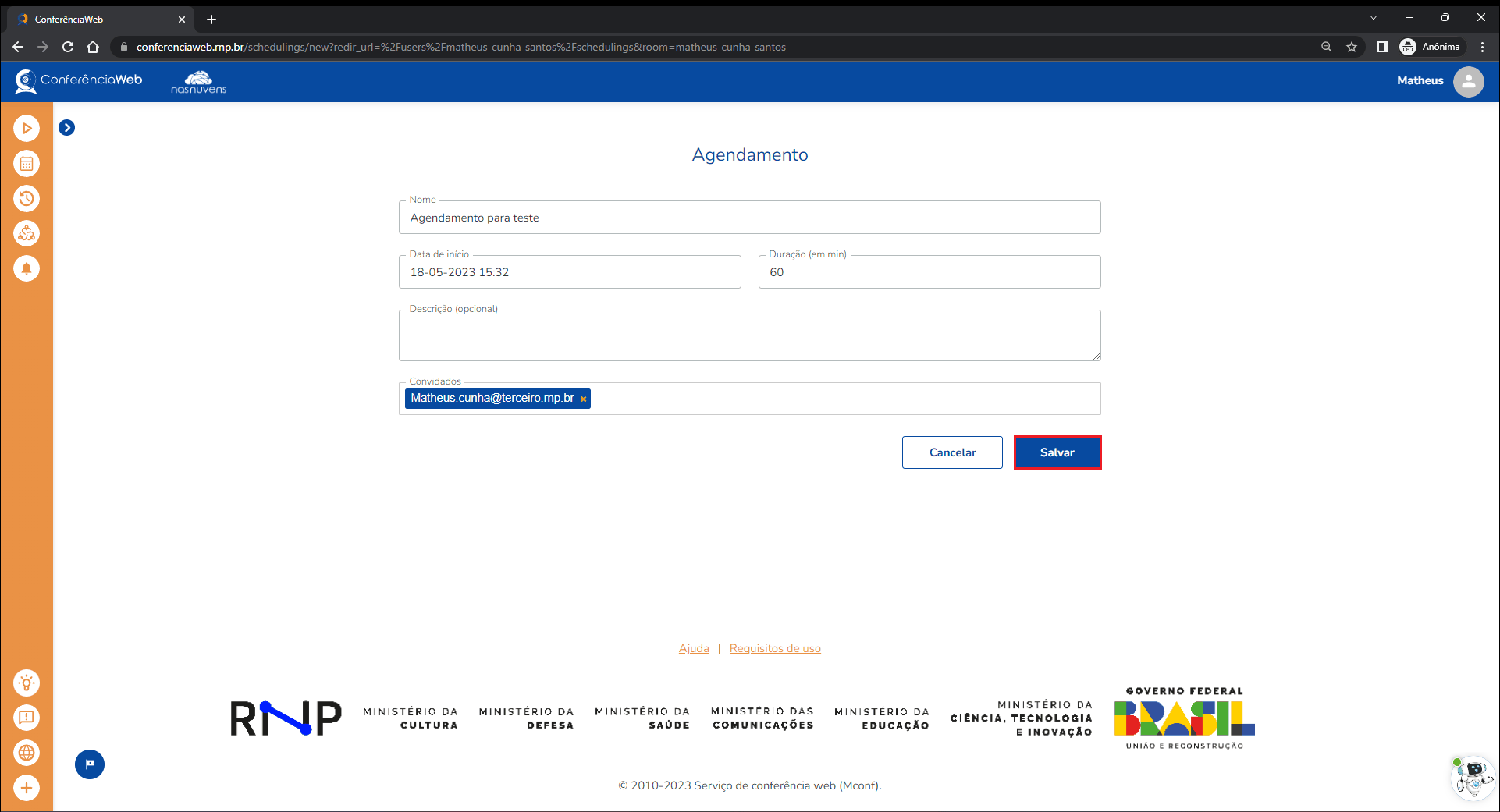 Em seguida, preencha todas as informações referente ao agendamento. Para enviar convite para participarem da conferência agendada, insira o e-mail do(a) convidado(a) no campo "Convidados".