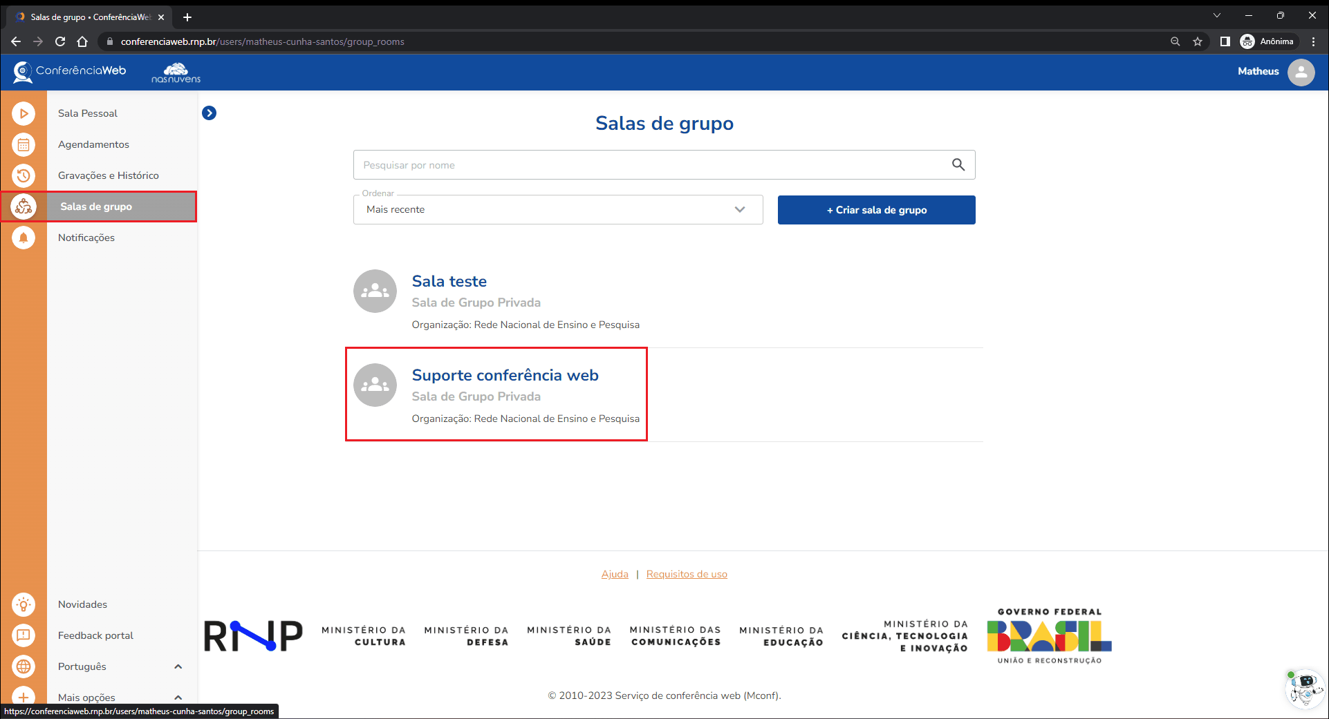 Para acessar, clique em "Salas de grupo" localizado no menu lateral esquedo.