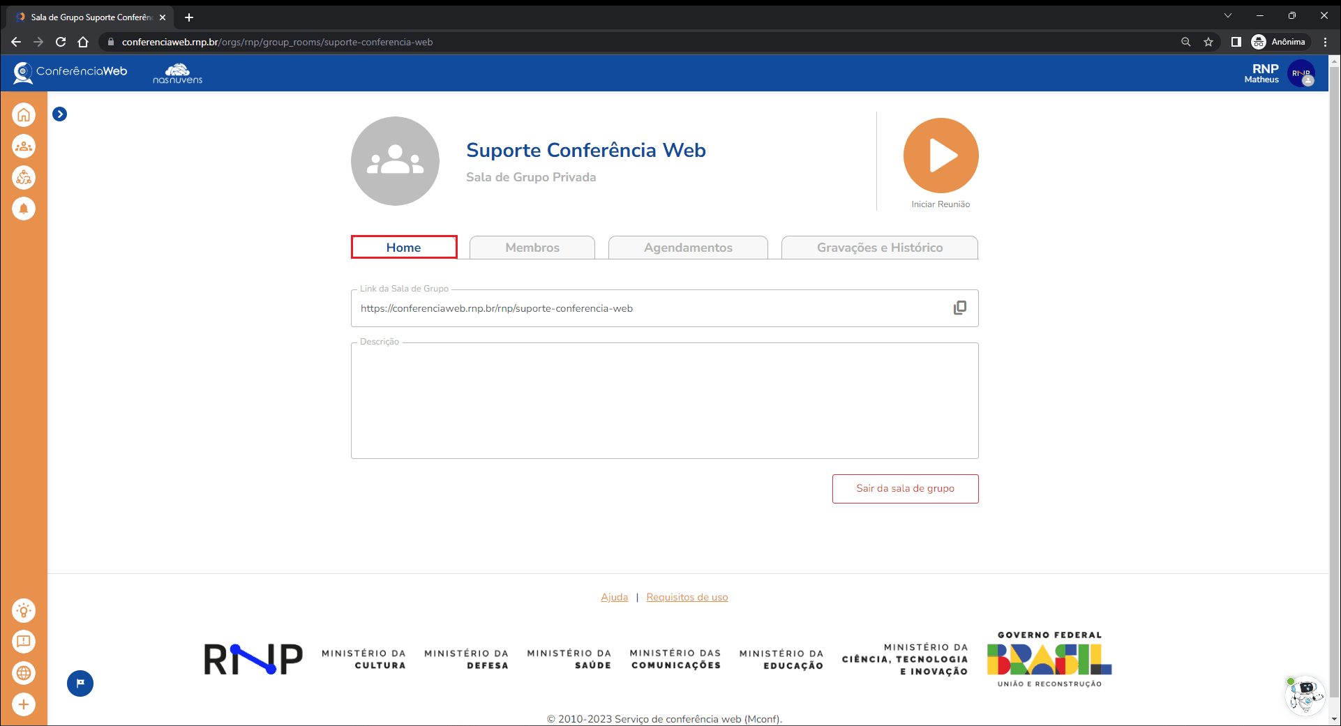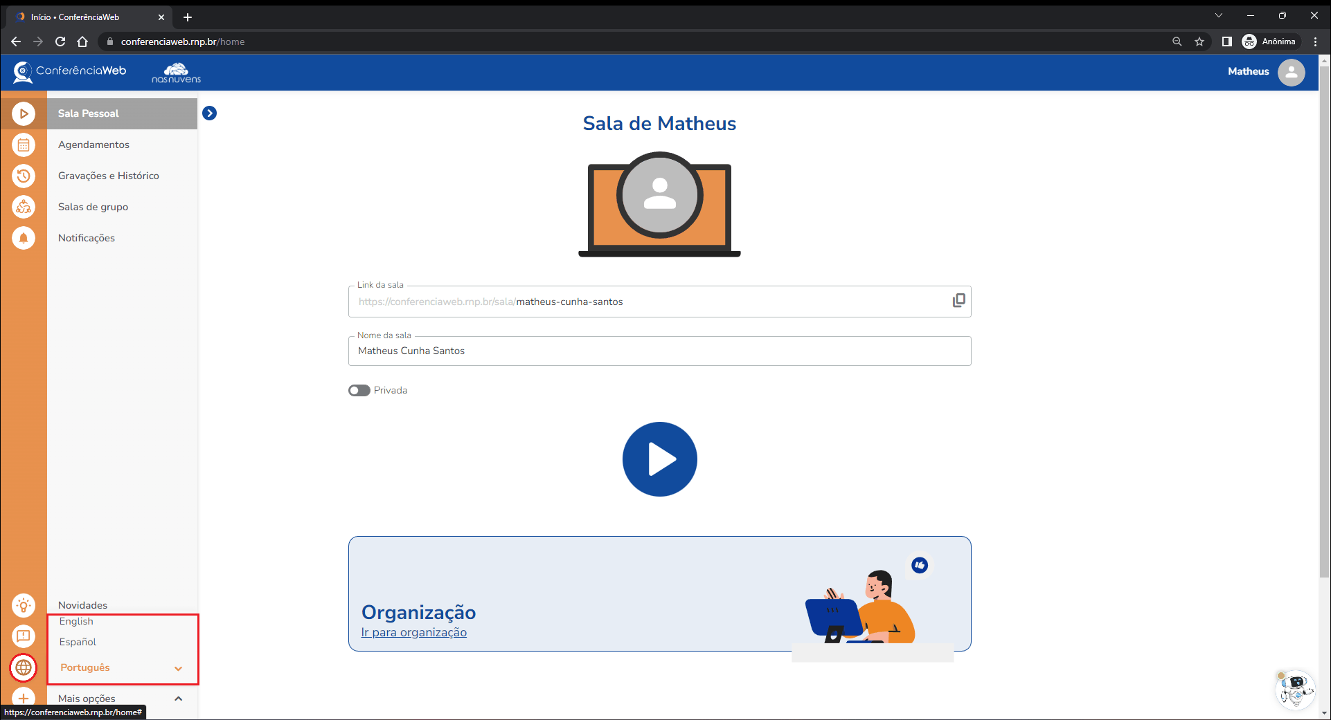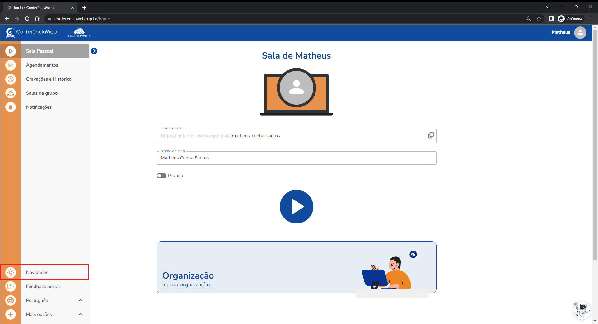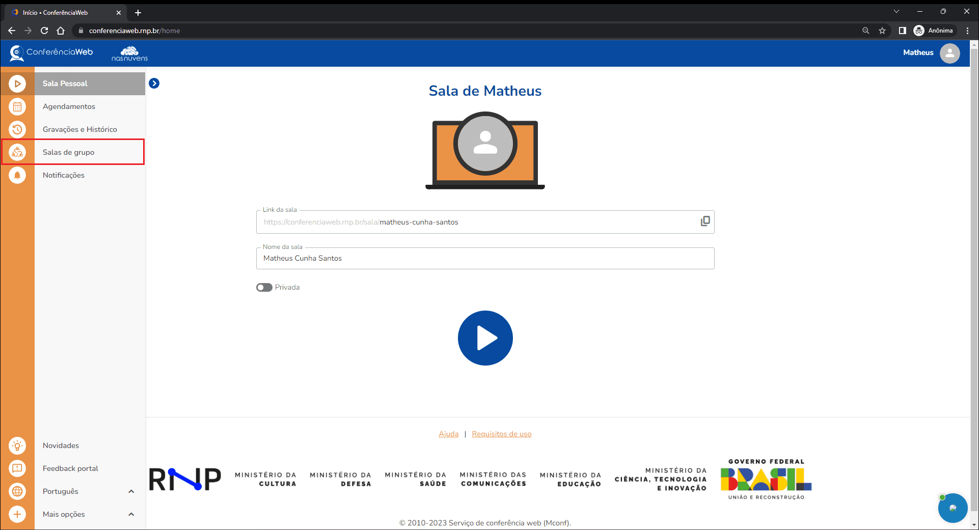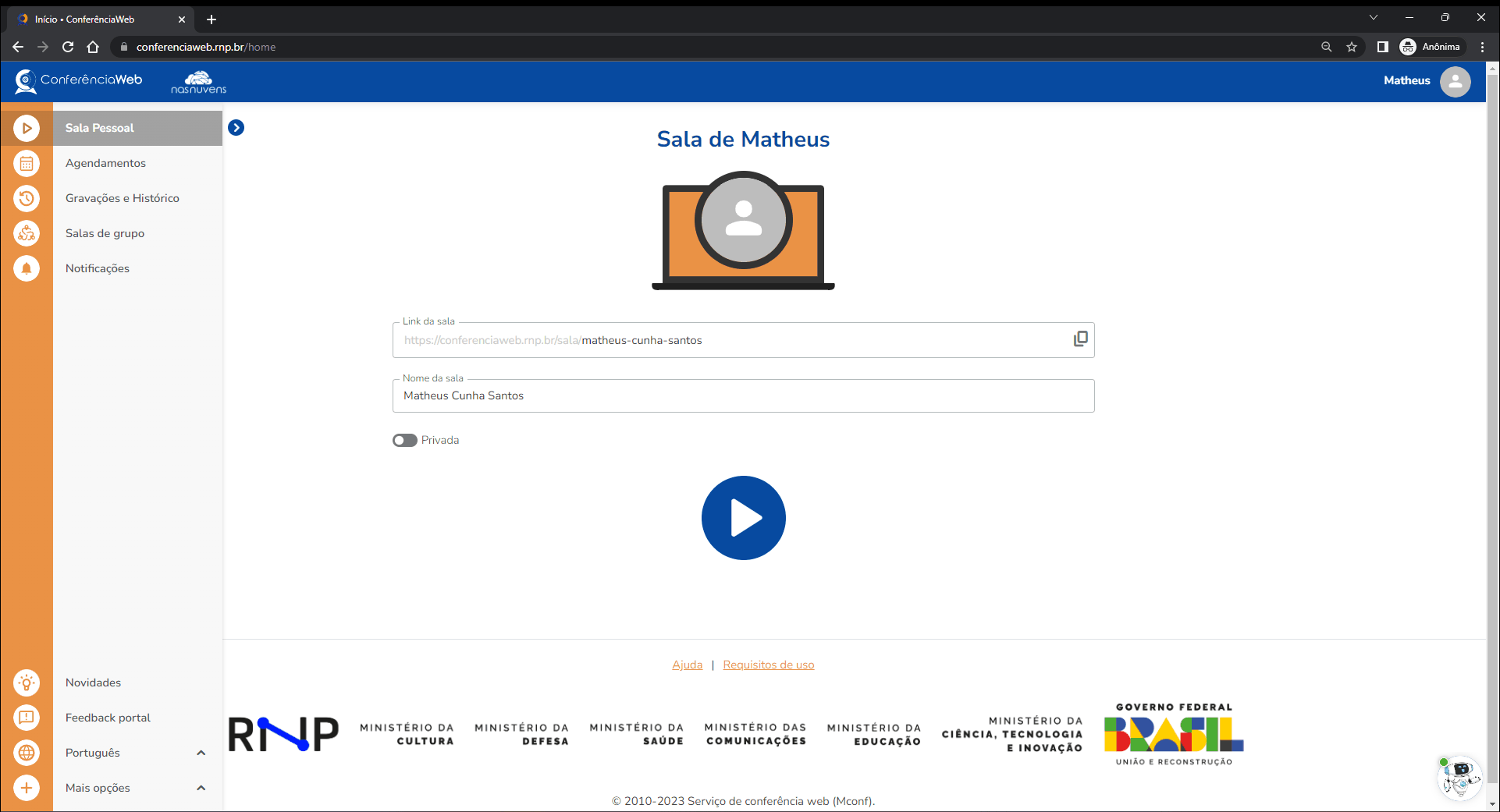 Na página inicial do usuário, ele verá em destaque sua sala pessoal. O link de convite e o nome da sala. Para iniciar uma conferência em sua sala pessoal, aperte no botão de "Play" localizado no centro da tela.