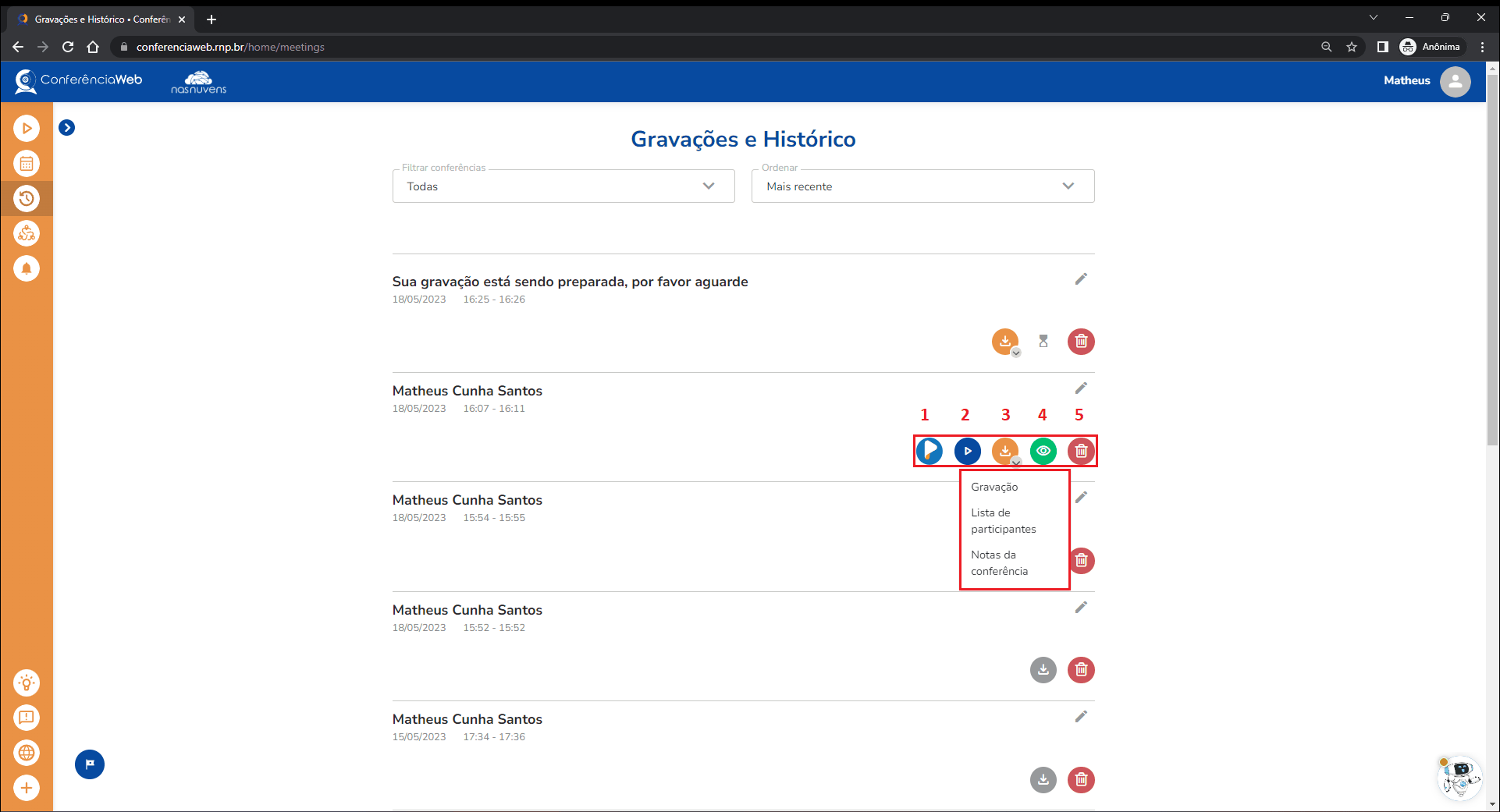 Caso sua conferência esteja processando para download, aparecerá a seguinte mensagem no título da conferência “Sua gravação está sendo preparada, por favor aguarde”.