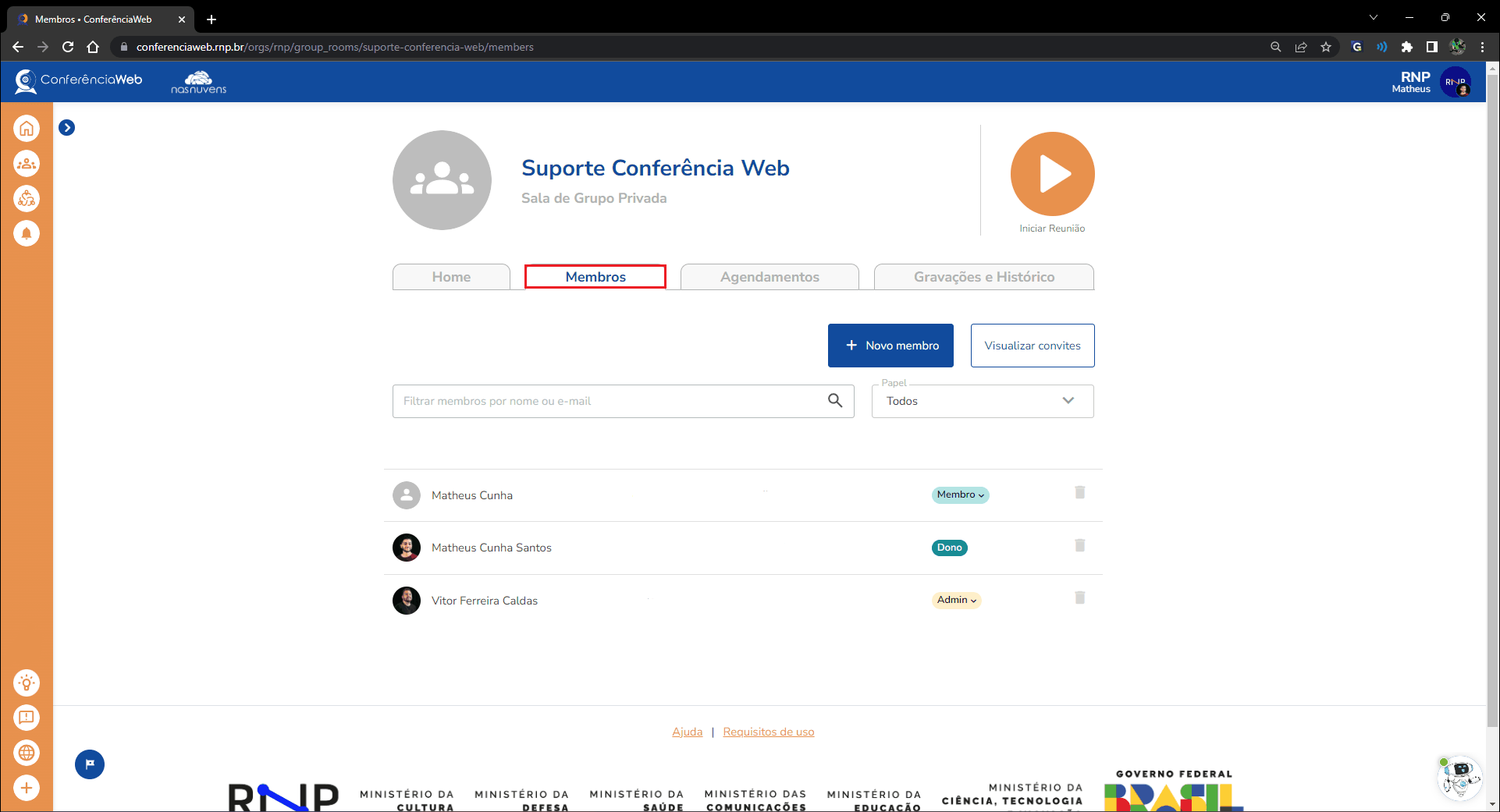- Administrador: Poderá gerenciar a sala de grupo, podendo enviar convites para novos convidados(as), remover membros, e gerenciar gravações.