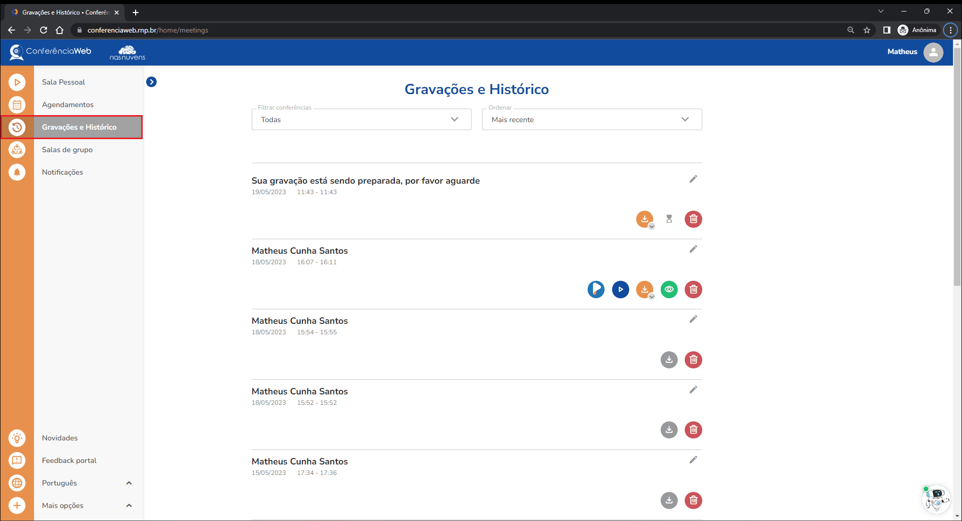 Nesta seção poderá ser encontrada todas as informações sobre as gravações realizadas na sala de grupo. Podendo reproduzir, fazer download da gravação, lista de participantes e notas da conferência.
