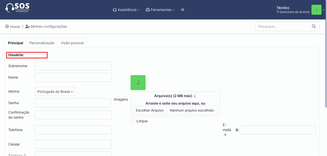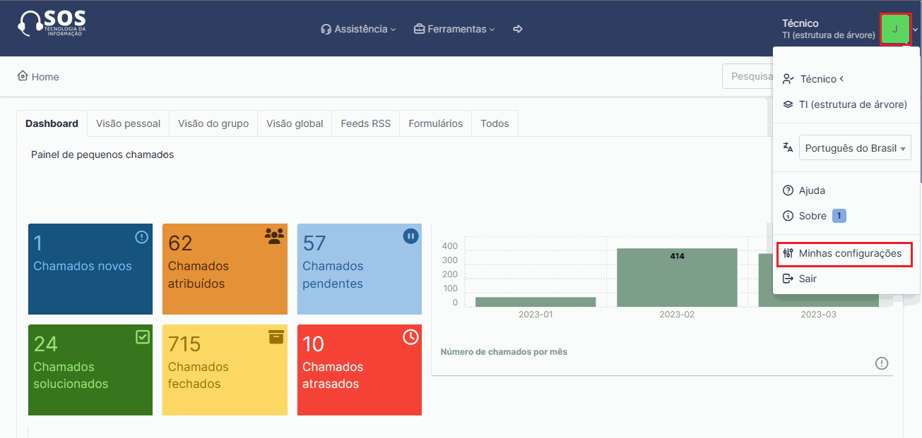 6 – Feito o login no SOSTI clique no perfil em seguida em Minhas configurações: