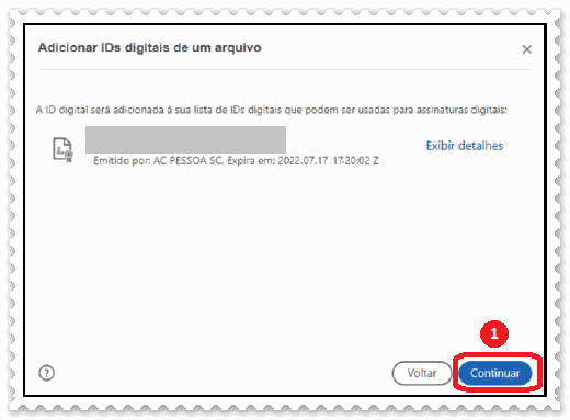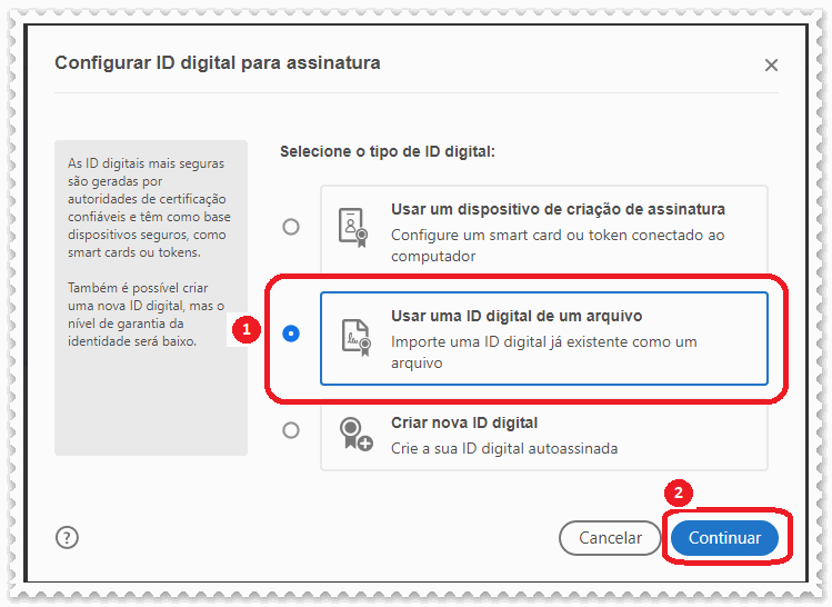 f) Selecione a opção (1) Usar uma ID digital de um arquivo e clique em (2) Continuar.