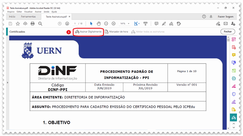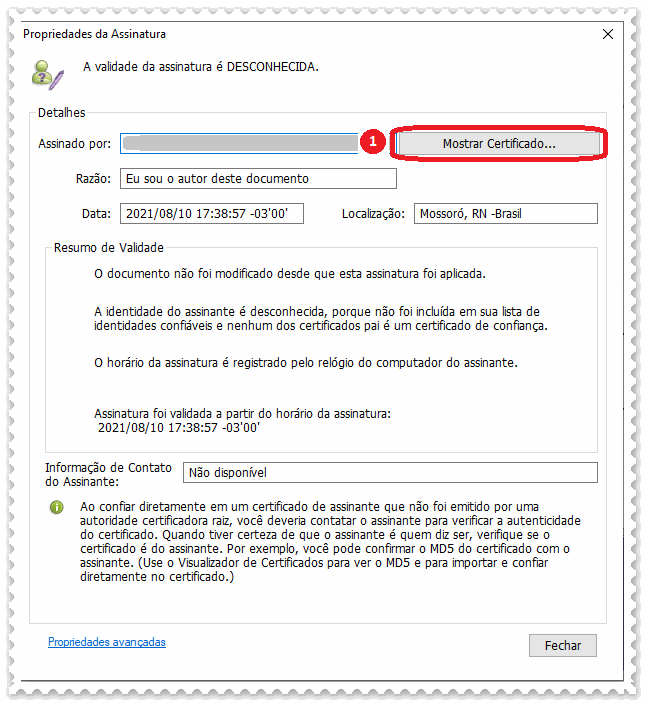 Atenção: Ao abrir o dumento assinado, um aviso pode aparecer. Isto não significa que ocorreu falha na assinatura. A mensagem é apresentada, pois a ICPEdu, entidade certificadora, não é universalmente reconhecida, mas o documento estará assinado.