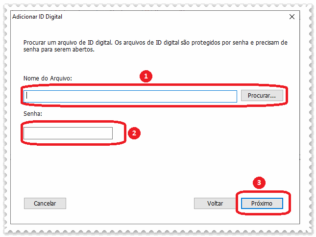 e) Clique em (1) Procurar para encontrar o arquivo que você gerou no ICPEdu (seu_nome_cpf-certificate.p12) e depois insira a (2) senha e clique em (3) Próximo.
