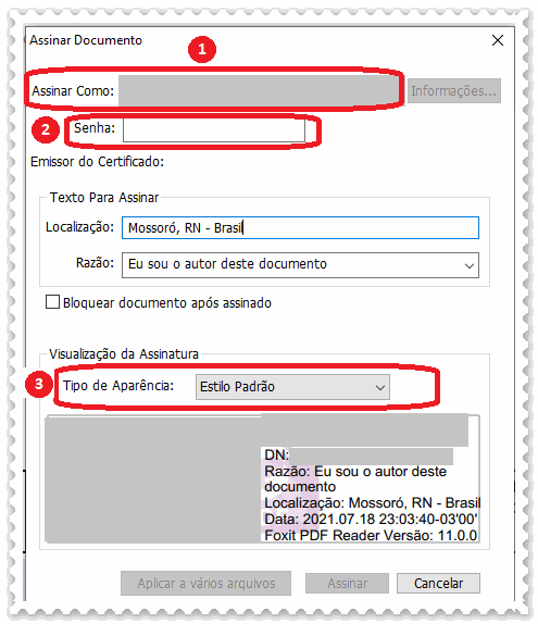 i) Será apresentada a imagem de como ficará a assinatura aplicada no documento. Verifique as informação em (1) Assinar Como insira a (2) senha. Recomendamos deixar o (3) Estilo Padrão. Após digitar a senha a opção “Assinar” estará disponível.