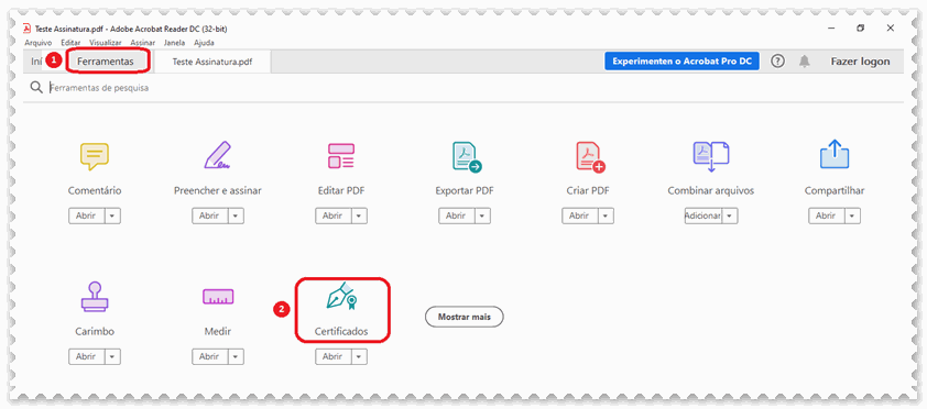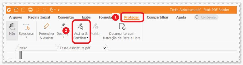 a) Abra o arquivo que pretende assinar e desça até a página que deve receber a assinatura. No menu (1) Proteger, selecione (2) Assinar & Certificar.