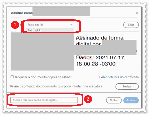 j) Será apresentada a imagem de como ficará a assinatura aplicada no documento. Selecione (1) Texto padrão e insira a (2) senha.