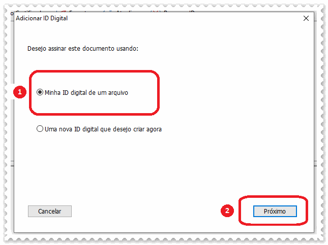 d) Verififique se a opção (1) Minha ID digital de um arquivo está selecionada. Caso não esteja, selecione e clique em (2) Próximo.