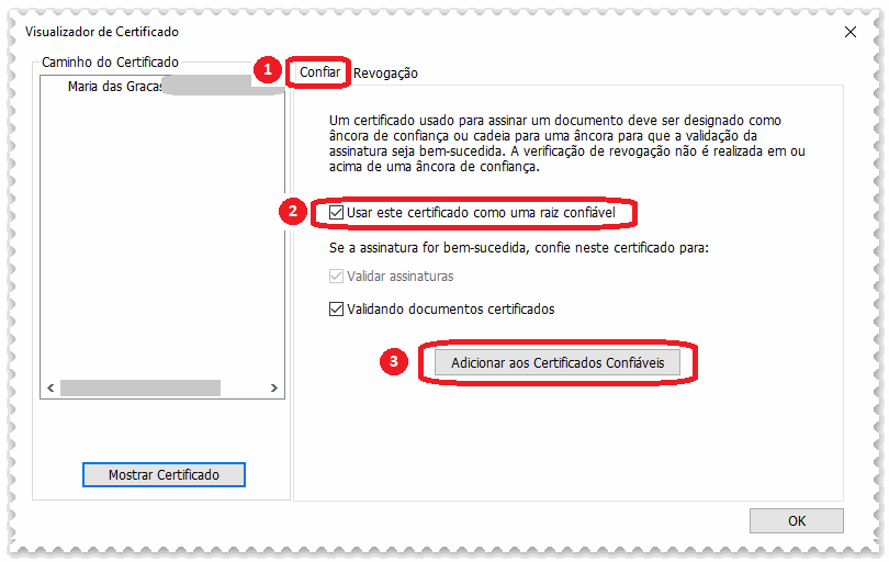 c) Na aba (1) Confiar, verifique se a opção (2) Usar este certificado como raiz confiável está marcada, se não estiver marque e clique em (3) Adicionar ao certificados confiáveis.