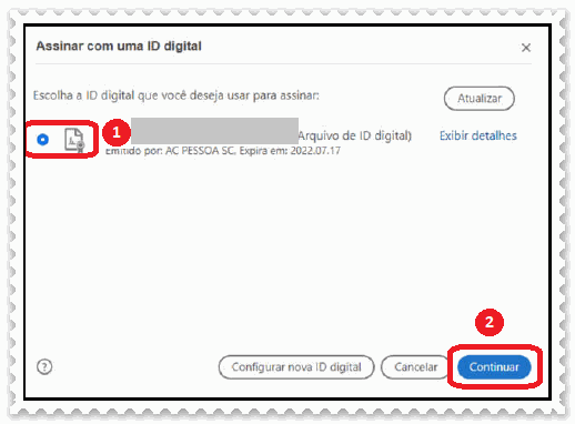 i) Selecione a ID digital para assinar o documento e clique em (1) Continuar.