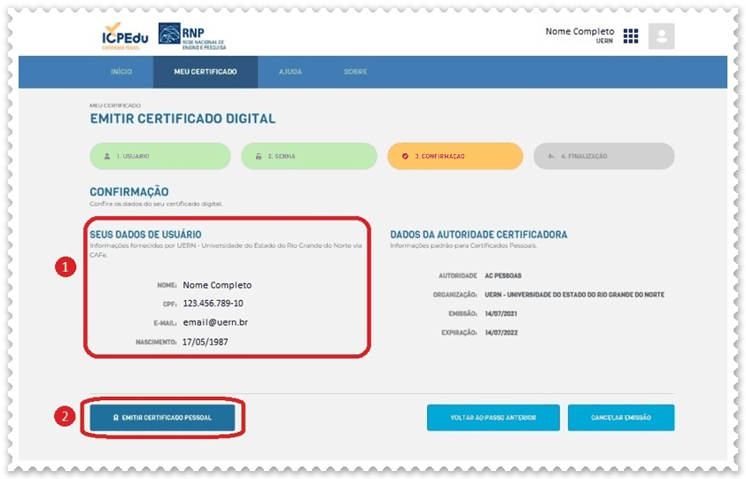 h) Verifique novamente se (1) seus dados estão corretos e clique em (2) emitir certificado pessoal.