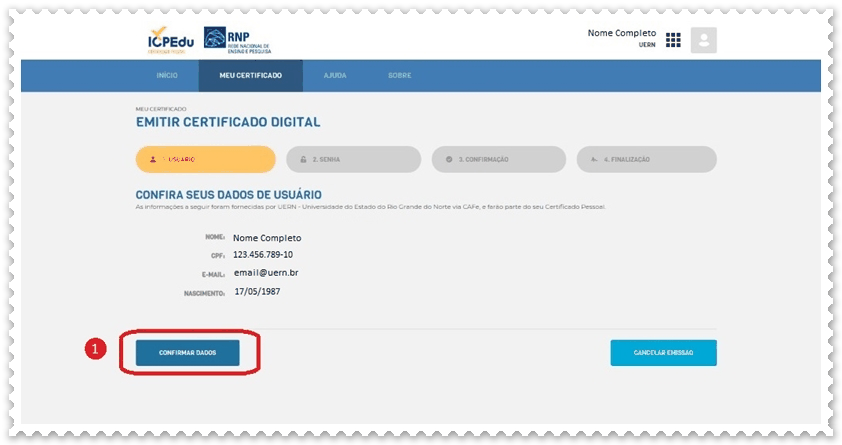 f) Confira seus dados de usuário. Caso exista divergência crie um chamado no SOS informando o problema. Se estiver tudo correto, clique em (1) Confirmar Dados.