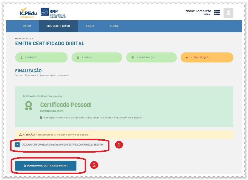 i) Selecione a opção (1) declaro que guardarei o arquivo do certificado em local seguro e em seguida em (2) donwload do certificado digital. Será baixado em um arquivo no formato seu_nome_cpf-certificate.p12.