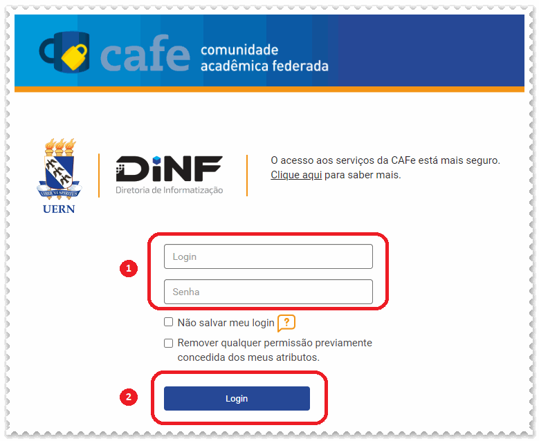 d) Informe o (1) login e senha e em seguida clique em (2) login. Lembrando que o login e a senha são os mesmo utilizados para acessar o SIGS e CAFe.