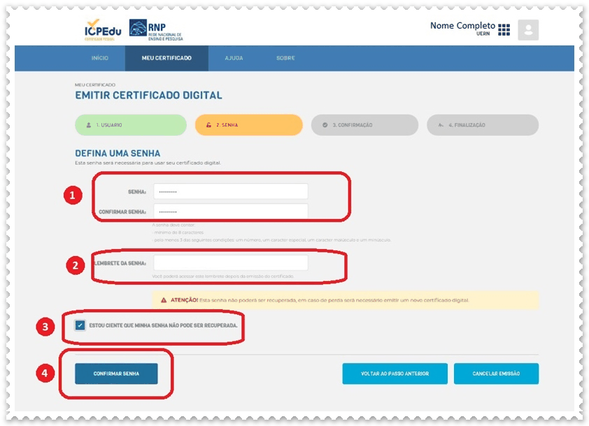 g) Crie uma (1) senha para o certificado, defina uma (2) lembrete de senha, selecione a opção (3) estou ciente que minha senha não poderá ser recuperada e em seguida clique em (4) Confirmar senha.