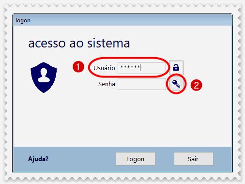 a) Abrir o diálogo de acesso ao sistema, informar sua (1) matrícula e clique no botão com a (2) chave;