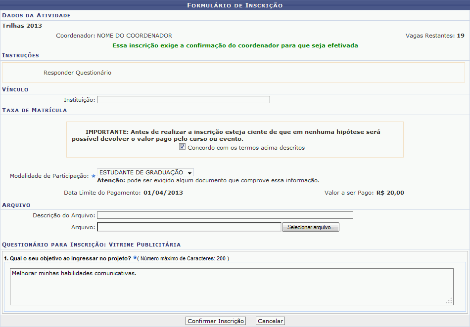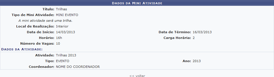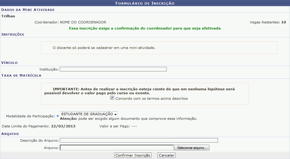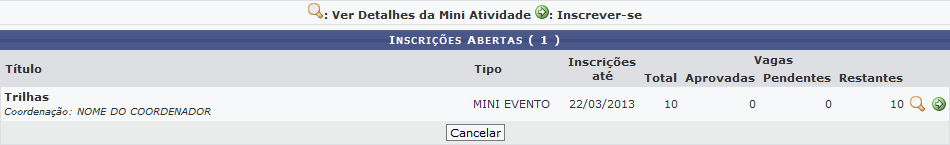 . Exemplificaremos a operação clicando na inscrição referente ao Mini Evento Trilhas. O sistema exibirá a seguinte tela: