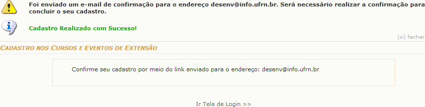 A mensagem de sucesso acima indica que o usuário cadastrado terá que confirmar sua inscrição num e-mail que receberá. O cadastro só será concluído após a confirmação.