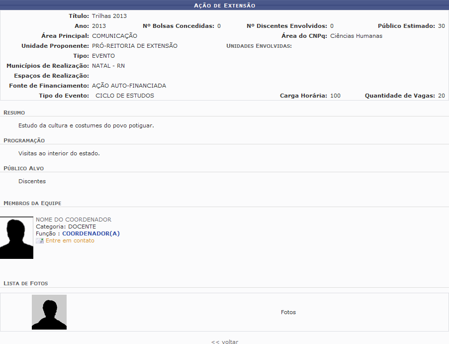 O usuário poderá entrar em contato com o coordenador da ação de extensão clicando no ícone