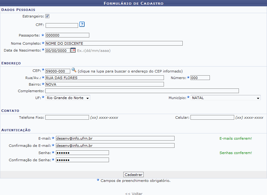 Confirmação de Senha: Confirme a senha fornecendo-a novamente;