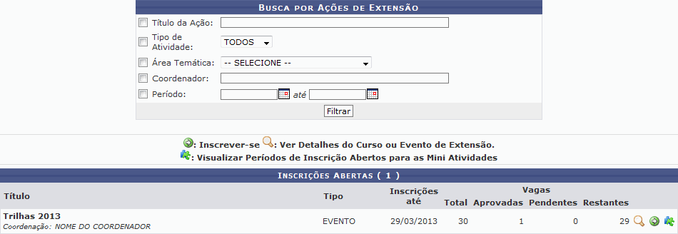 Na tela apresentada acima, o usuário poderá Inscrever-se, Ver Detalhes do Curso ou Evento de Extensão e Visualizar Períodos de Inscrição Abertos para as Mini Atividades. Estas operações serão explicadas separadamente nos subtópicos a seguir.