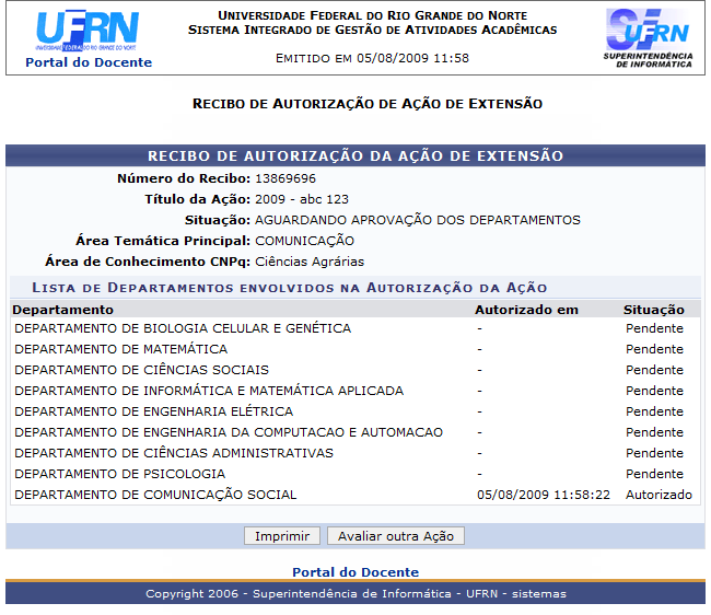 Clique em Imprimir para imprimir o documento, ou em Avaliar outra ação para retornar a lista de