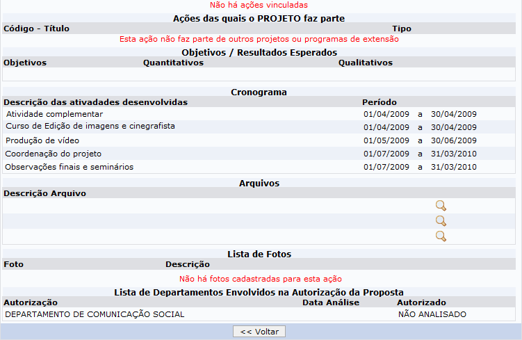 Clique em Voltar para retornar a lista de ações de extensão.