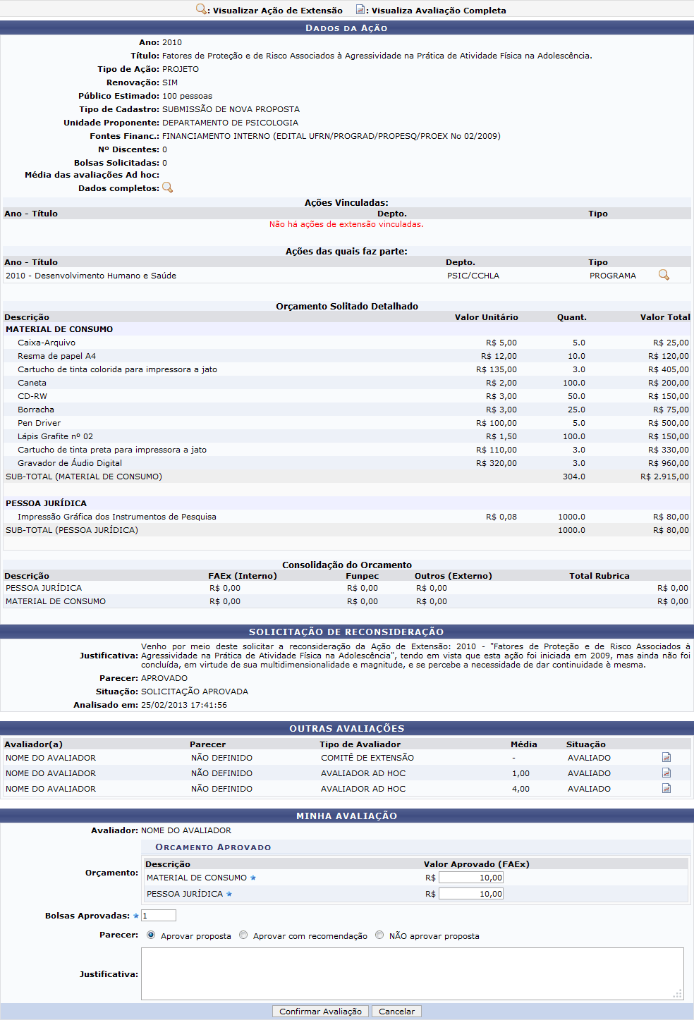 - Parecer: Escolha o parecer da avaliação, entre Aprovar proposta, Aprovar com recomendação e