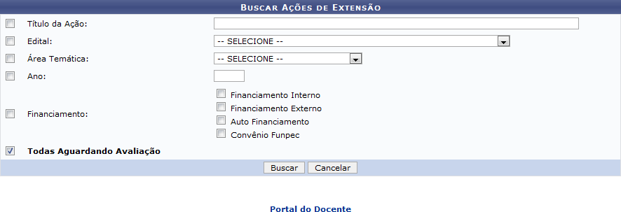 Financiamento Interno, Financiamento Externo, Auto Financiamento e o Convênio Funpec; - Todas Aguardando Avaliação: Escolha esta opção para buscar por todas as ações de extensão