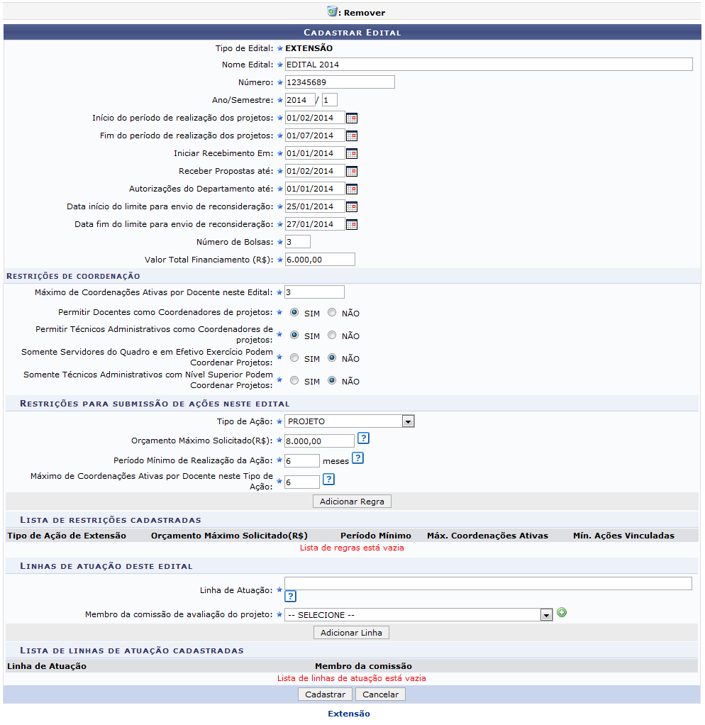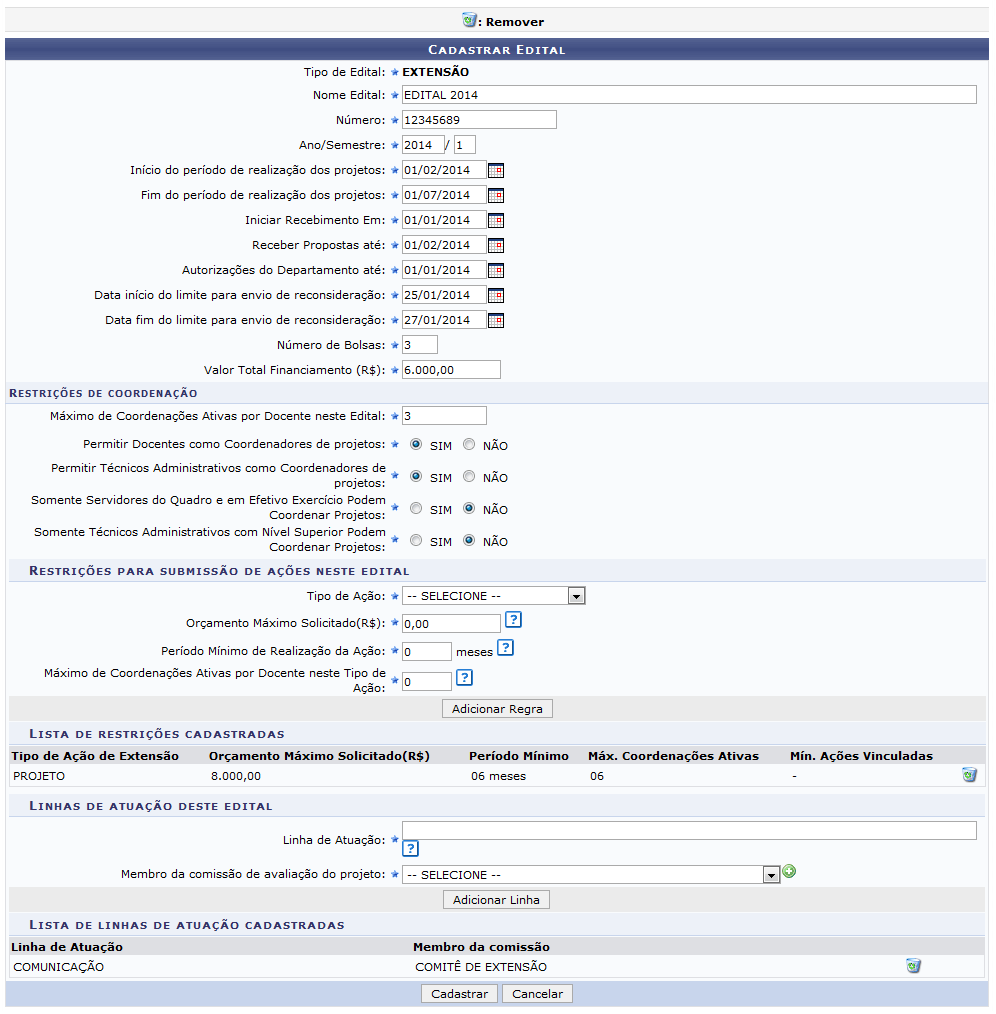 Esta funcionalidade permite o cadastro de um edital de extensão. O edital é o documento emitido