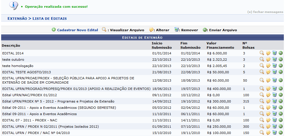 Seguida pela mensagem de sucesso, será exibida a lista com os Editais de Extensão cadastrados no