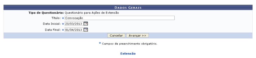 Na tela acima, o usuário deverá informar o Título do questionário, fornecer a Data Inicial e Data Final