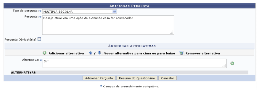 Alternativa: Conforme o Tipo de Pergunta informado, o sistema exibirá esta opção