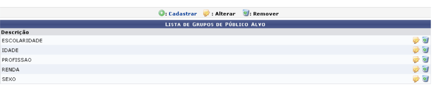 De volta à tela de Cadastro de Grupo de Público Alvo, clique em para visualizar a lista dos