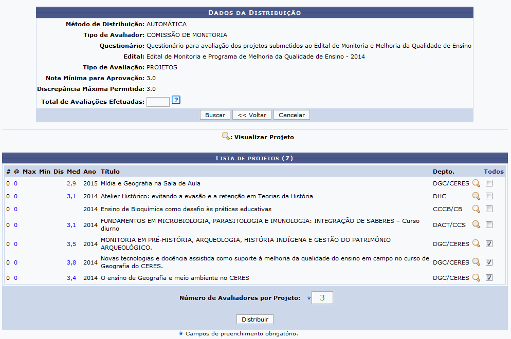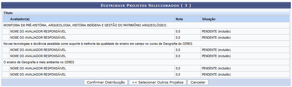 Exemplificaremos, indicando para o Número de Avaliadores por Projeto com a quantidade 3. Após preencher os dados necessários, clique em Distribuir. O sistema exibirá uma tela com os projetos selecionados, semelhante a esta: