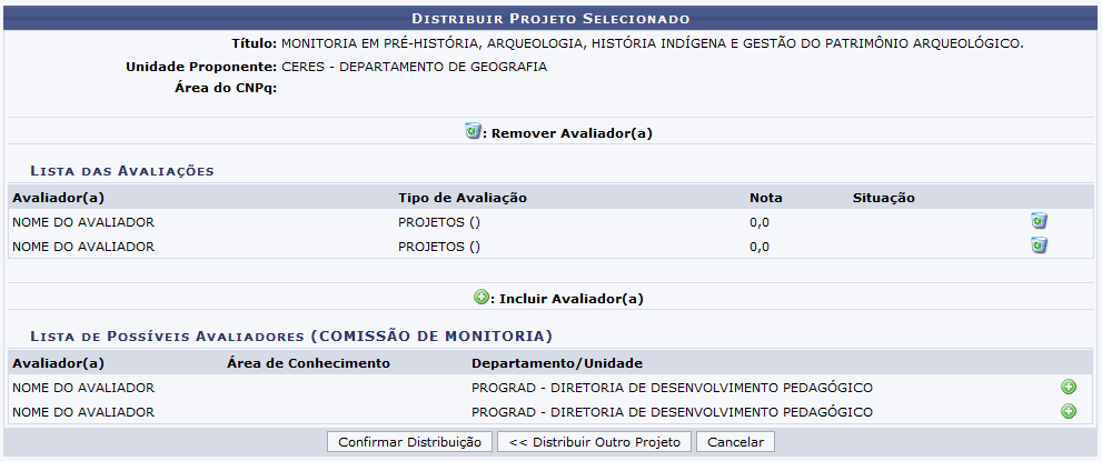 Como exemplo, selecionaremos o projeto MONITORIA EM PRÉ-HISTÓRIA, ARQUEOLOGIA, HISTÓRIA INDÍGENA E GESTÃO DO PATRIMÔNIO ARQUEOLÓGICO. A página para Distribuir Projeto Selecionado, conforme a seguir: