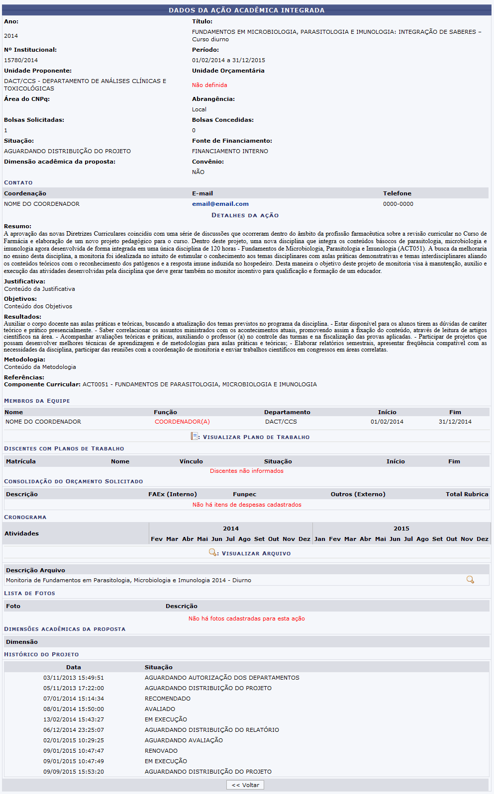 Exemplificaremos, selecionando o projeto FUNDAMENTOS EM MICROBIOLOGIA, PARASITOLOGIA E IMUNOLOGIA: INTEGRAÇÃO DE SABERES – Curso diurno. A página com os Dados da Ação Acadêmica Integrada, será exposta: