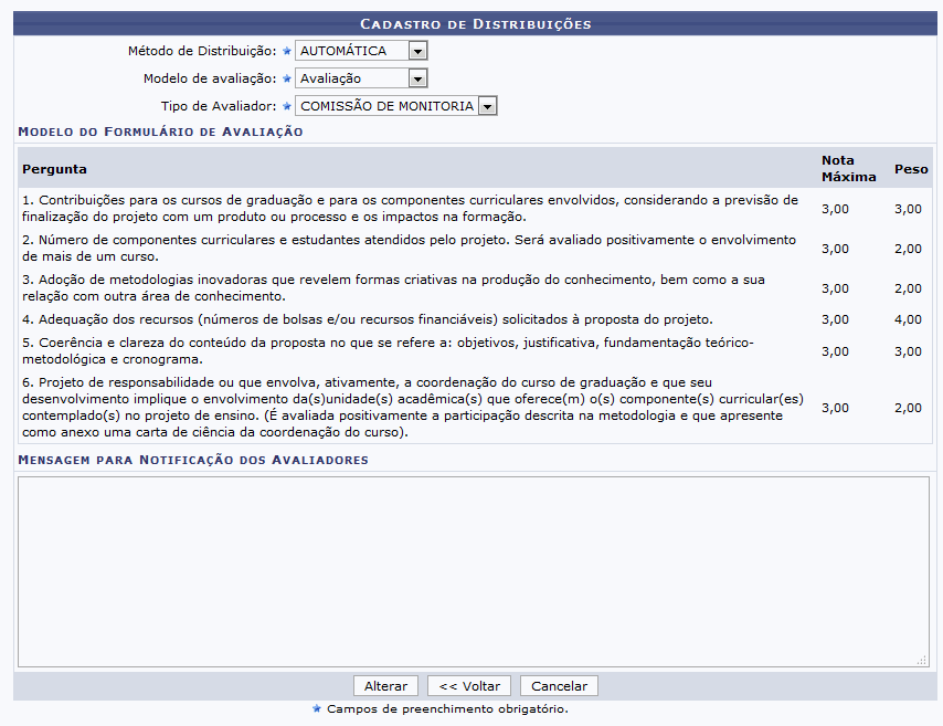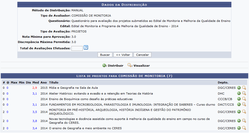 Para realizar esta operação, acesse o SIGAA → Módulos → Monitoria → Comissões → Avaliações → Distribuir.